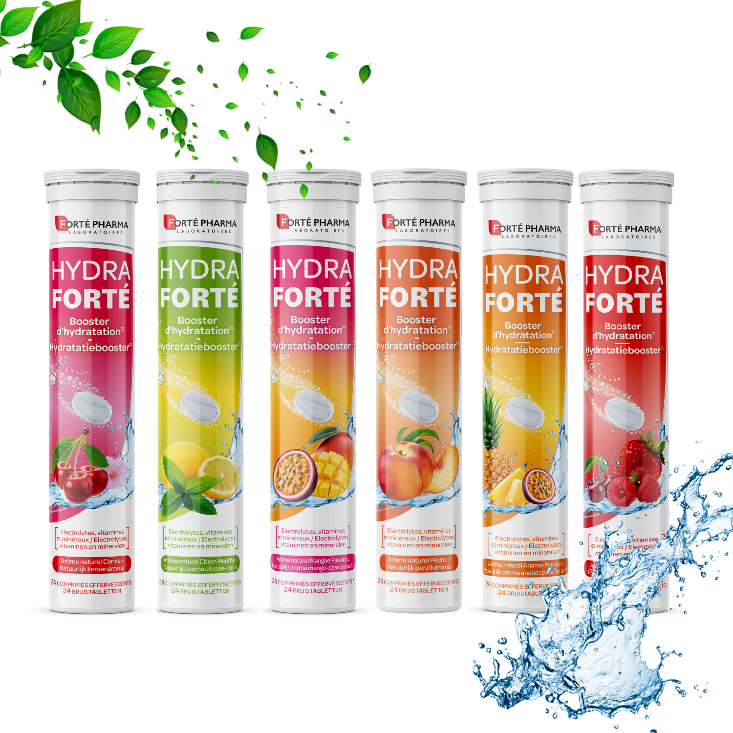 Het Hydra Forté-gamma combineert elektrolyten (een mix van essentiële mineralen voor het lichaam) en vitaminen om een goed elektrolytenevenwicht(1) te ondersteunen, wat bijdraagt aan dagelijkse hydratatie.